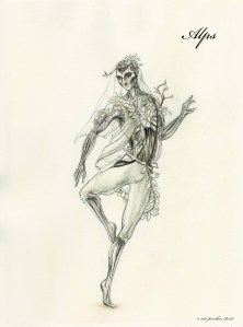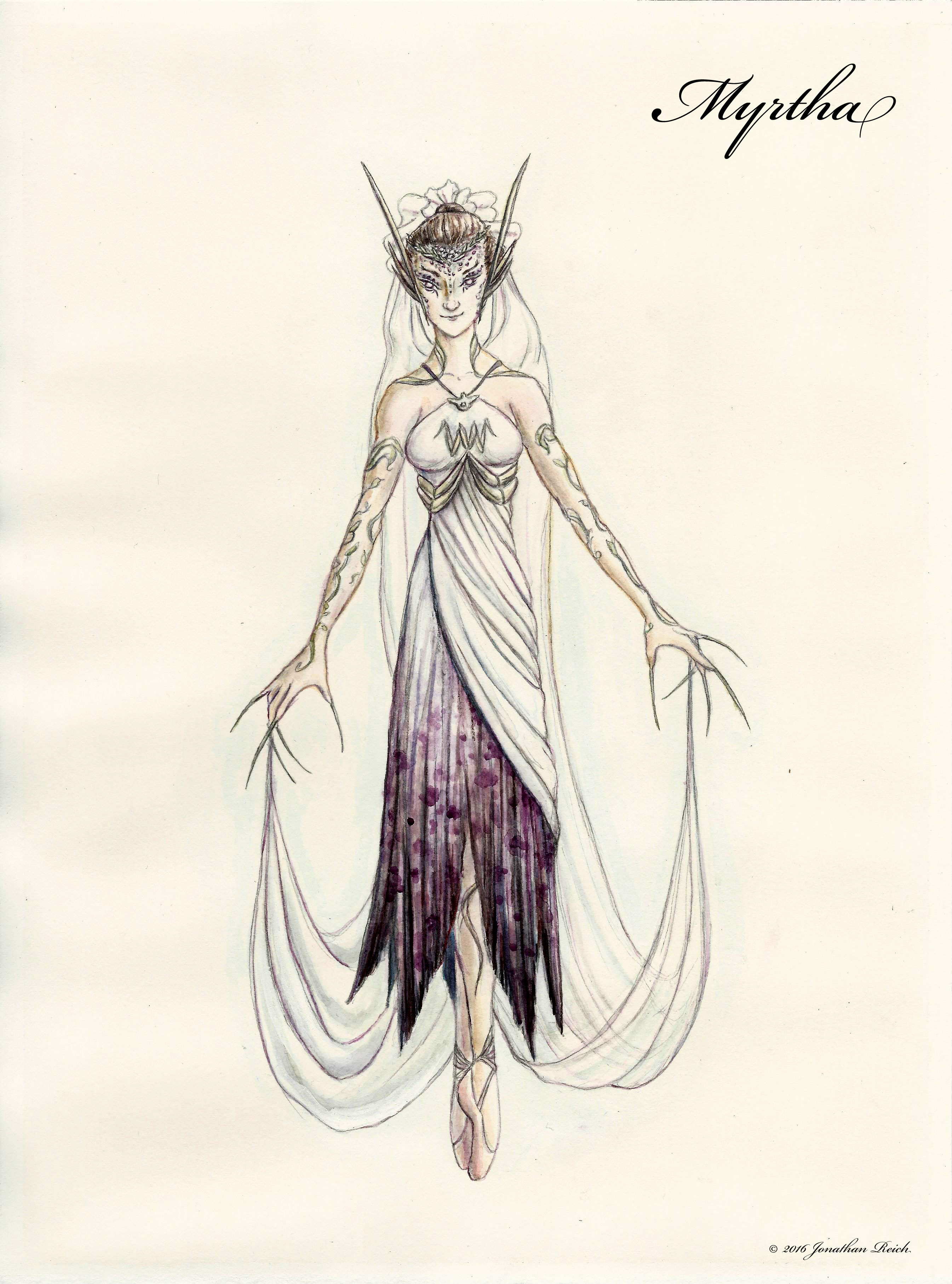 Myrtha was crucially important but particularly difficult to design for. Most of the difficulty came from trying to figure out her backstory. Willis come from the same root as vampires and are defined as a type of air spirits but there wasn’t any reason for them to take on a posse of the dead to kill unsuspecting humans so we had to question Myrtha’s motives and just what exactly she was. Was she a death goddess? Was she like a vampire collecting victims to fuel her existence? A vengeful spirit seeking retribution for being jilted herself or a friend who was jilted? Was she more of a zombie or a dead person herself? Where did her power come from? All of these classifications could have different bearings on her design. I finally settled on a fairy interpretation.