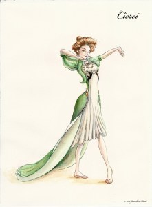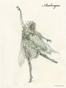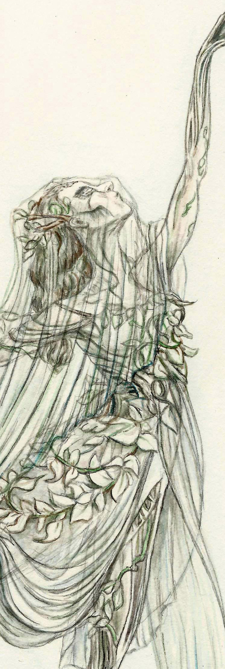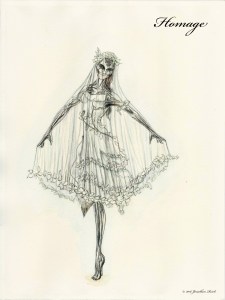 It seemed to make the most sense in that Myrtha doesn’t make sense. She’s too focused and specific in her attentions to be a death goddess, she didn’t seem needy or demonic enough to be a vampire, a spirit was too emotionally unstable (as well as weaker and less commanding than I wanted her), and zombie or dead person were nice for aesthetic reasons but didn’t explain her powers. Whereas fairies operate on a different moral level than humans, they are capricious, their powers have ambiguous sources, and we don’t ever completely understand them. This helped me pare down the design elements to make the costume more functional and keep ideas that were central to the character, opting for a tall slim silhouette and floral symbolism.