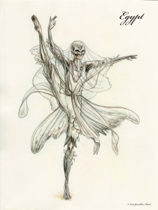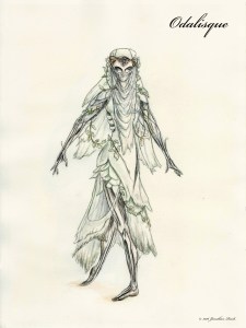 Caleb wanted all the wilis to have individual costumes, different body types, and to be more like zombies than pristine spirits. He was keen on the idea of dirty feet from dancing barefoot and working grey and wear up into the costumes. In the original ballet they are much more spirit-like, figuring out Myrtha’s design and supernatural classification were key for coming to grips with how to design these dead people. After much experimenting I rationalized them into the creatures described above, mixing spirit, zombie, and nature together. In the original ballet they wanted to make their costumes as diaphanous as possible, it also called for different ethnicities including 3 German women, two French women, a Bayadere (Hindu temple dancer), and an Odalisque (a servant to a harem) the rest were unspecified; I imitated both ideas.