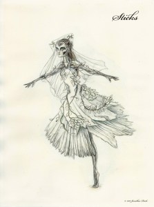 Wilis are the souls men and women who were jilted and died before their weddings. They come from all over the world and have been collected through the centuries. Myrtha calls them to dance at night in different places and their souls and bodies come to do her bidding. Over time parts of them succumb to rot or are lost but are replaced by plants and the bones of people and animals of the locale they come to, for they must always have a body to dance with. The older a wili becomes the more of its identity is lost and it is stripped down to a mere soul trapped within an assemblage of foreign parts.