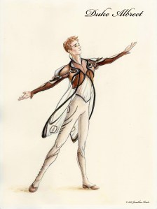 Albrecht goes to Giselle’s grave in a certain state of shock, a mixture of disbelief, surprise, remorse, and bereavement, many of which he is feeling fully for the first time. He began his campaign for Giselle as a lark and, without realizing until it was too late, came to truly love her. In Act II Albrecht shows himself for the noble he is. As a younger member of the elite his design follows the basic guides that Théophilé’s does but, in keeping with his character development, is more somber and less flamboyant. Compared to Act I his neckline is less cavalier, leather is almost entirely removed, and the light colors are traded for roasted oranges and browns to show, in part, a sense of mourning without resorting to the traditional black, his emotional deepening, a reference to an aged monarch butterfly, and to give him warm tones to show life in contrast with the cool colors of the dead willis. The “tails” of his coat are pinned up to his back to make dancing easier while keeping the same basic silhouette as his Act I costume and the fully developed butterfly motif of the nobility.
