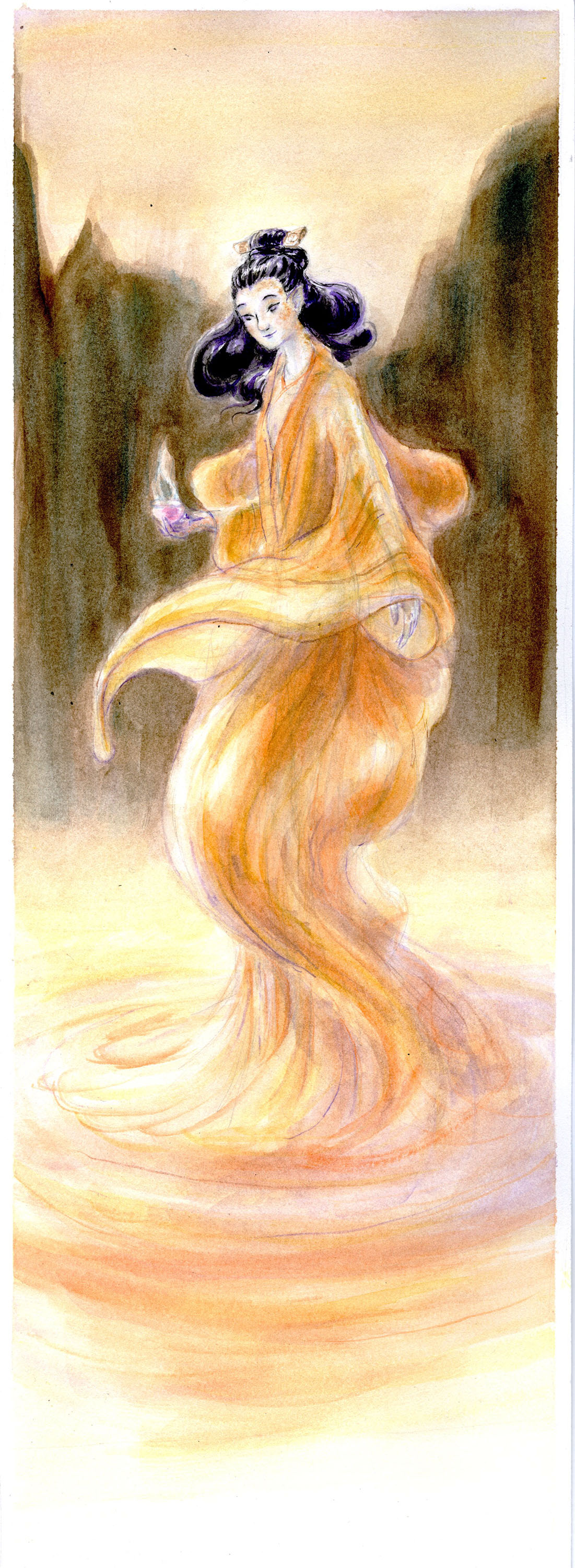 Elegant amphibious humanoids living in pools in that have been turned to tea by the enormous plants that live in them. These people take solid form in their underwater environment but out of water their bodies polarize tea into robes which, along with their hair, float in the air. They are very peaceful and friendly, they make their homes on large beanstalk-like plants that grow in the tea pools.