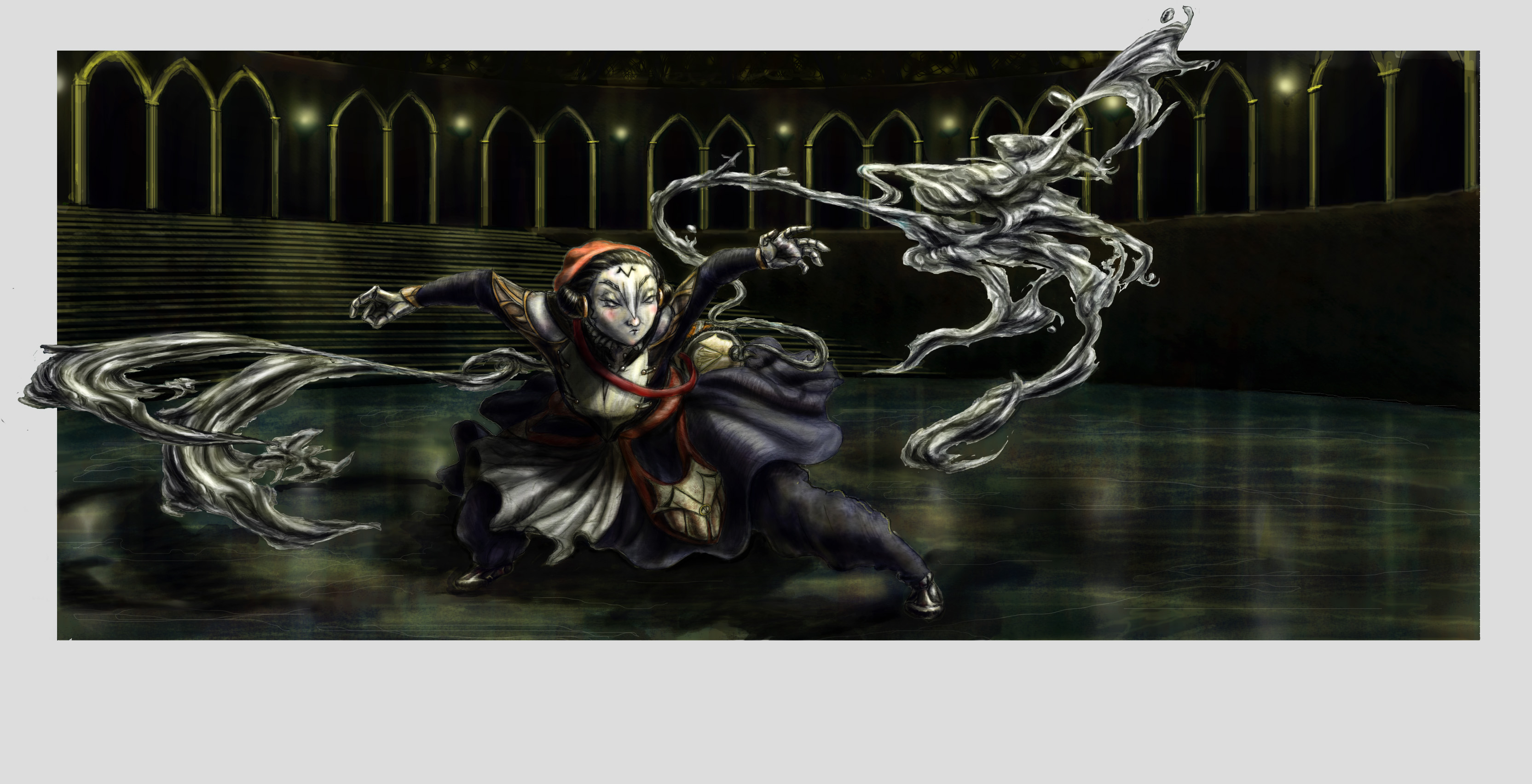 The smallest and fiercest of the Marlequin guard, she lacks strength but possesses speed and agility in abundance. Drosselmeier gave her the knowledge and tools to be a mechanic/doctor for the Marlequins, as well as a most curious weapon. She carries a canteen of liquid she steel that she polarizes into whips and weapons at will. The canteen it is a singular feat of creation accomplished but studying the Tea people and mimicking their abilities, it also possesses an enhanced range of control. She merciless, a master of analysis physics estimation using her size, speed, and momentum dictate her battles and eviscerate her foes.